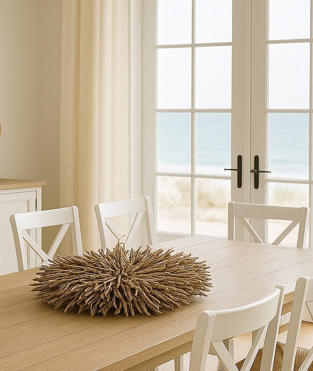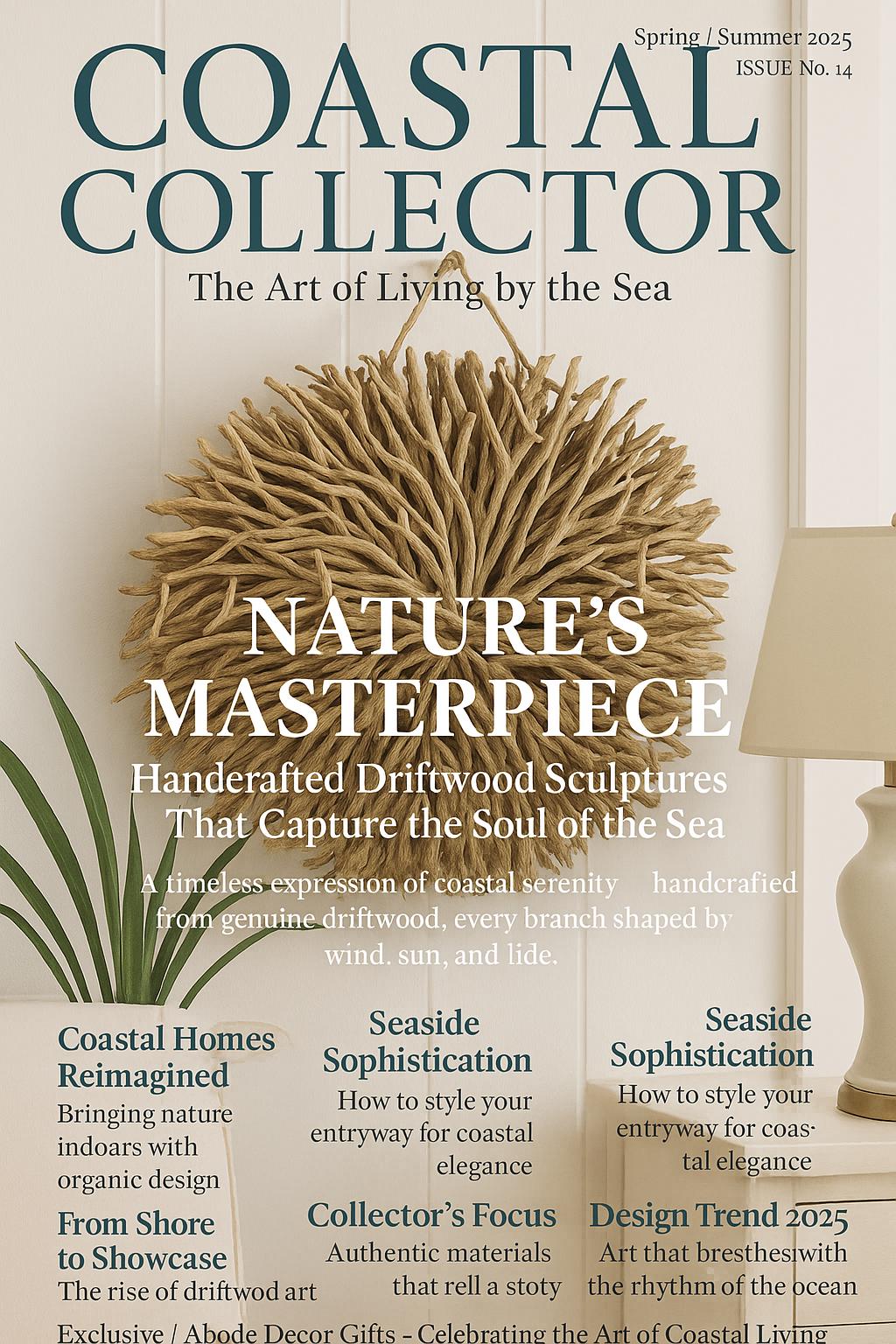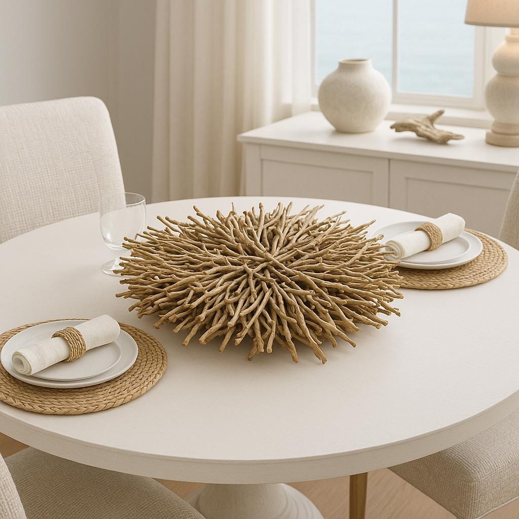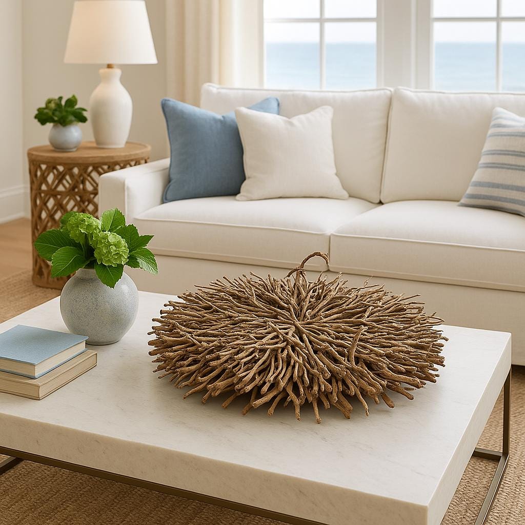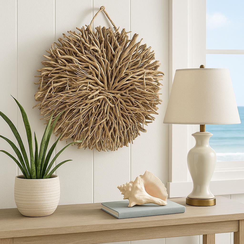 Each handcrafted piece is composed of hundreds of branches, carefully arranged into a radiant circular design that embodies organic movement and coastal sophistication. Whether displayed as a wall sculpture or used as a table centerpiece, this statement piece adds texture, warmth, and timeless seaside charm to any setting.
