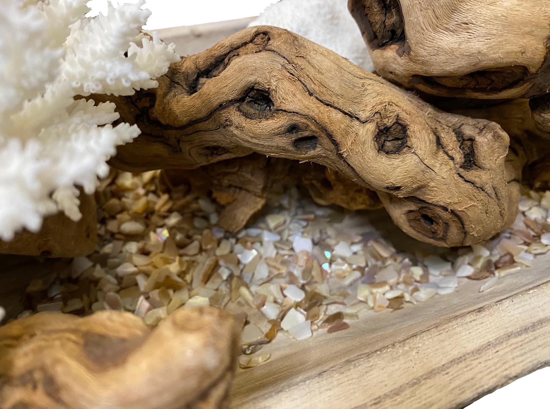 The natural movement of the grapewood contrasts beautifully with the soft white coral textures, creating depth, balance, and sophisticated coastal warmth. At 30 inches long, it commands attention without overwhelming your space.