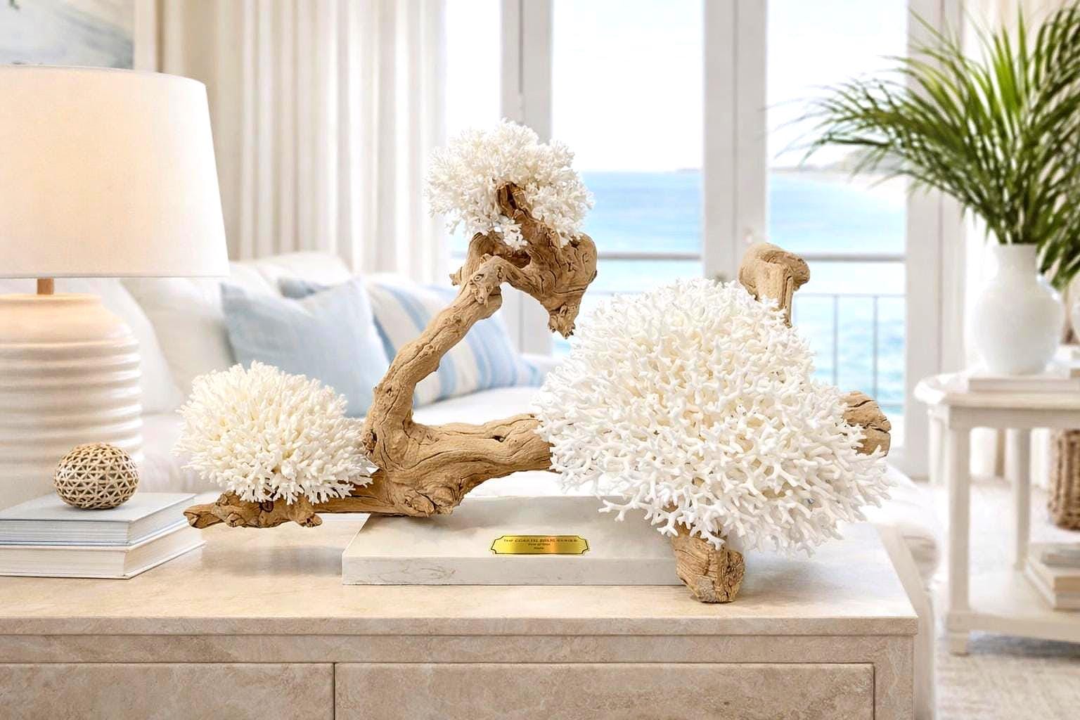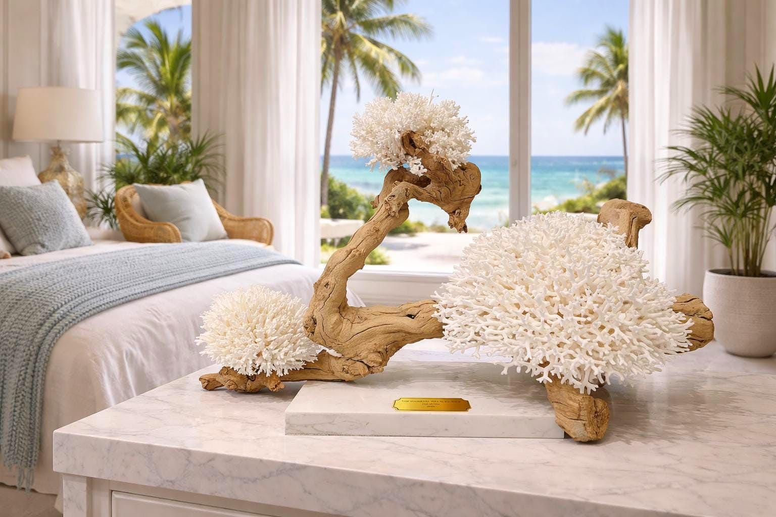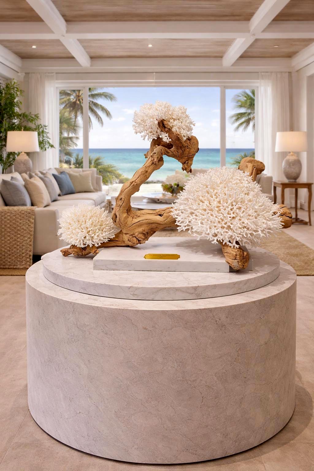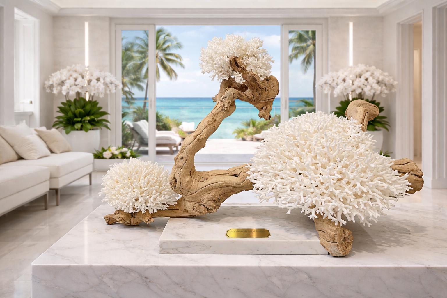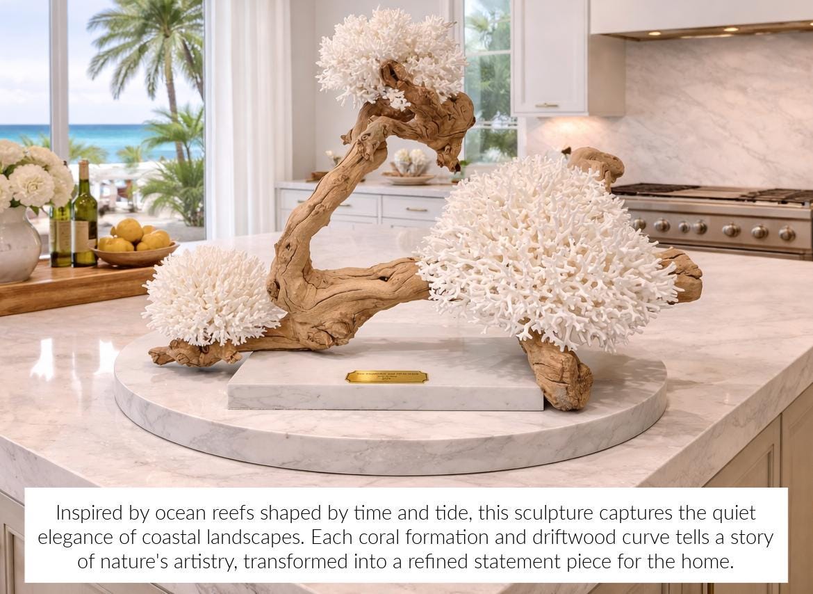 A one-of-a-kind coastal sculpture crafted from natural driftwood and pristine white coral, mounted on a solid marble base. This museum-quality statement piece brings the organic beauty of the ocean into refined interiors and is designed to serve as a striking centerpiece in luxury coastal homes.