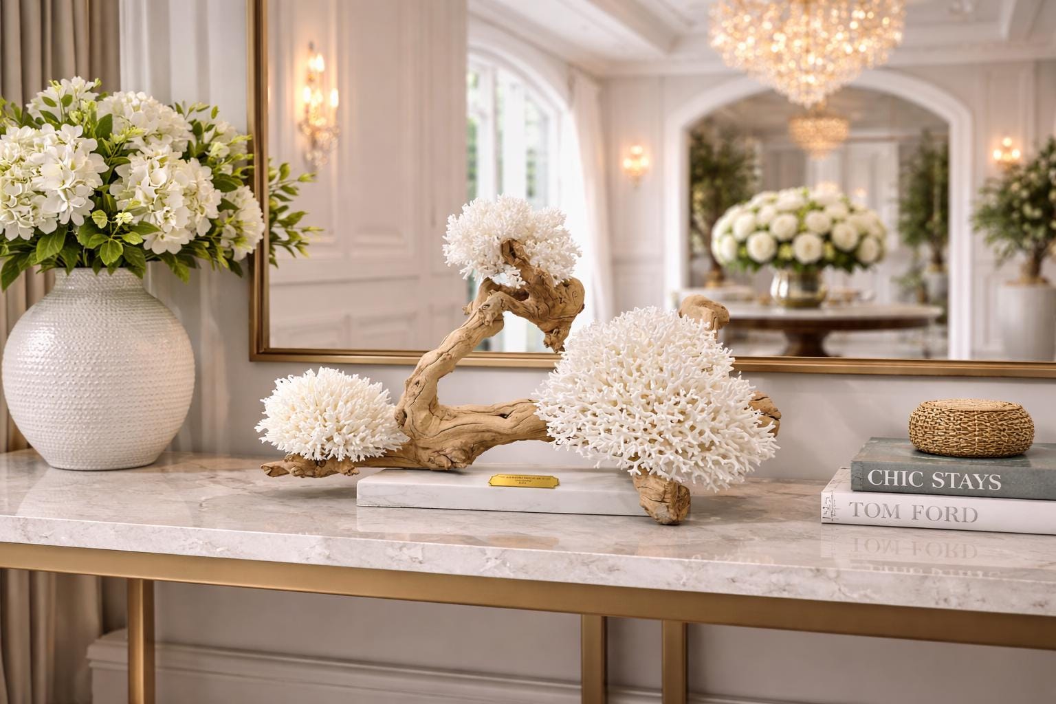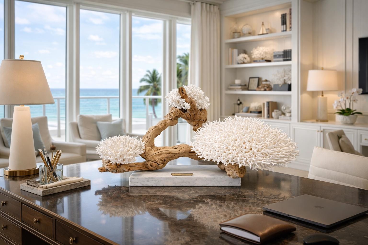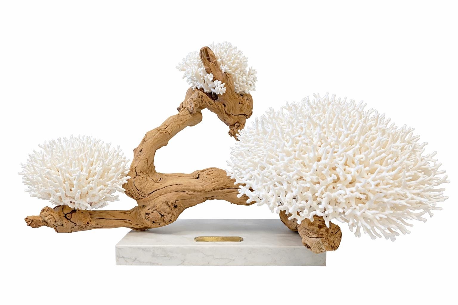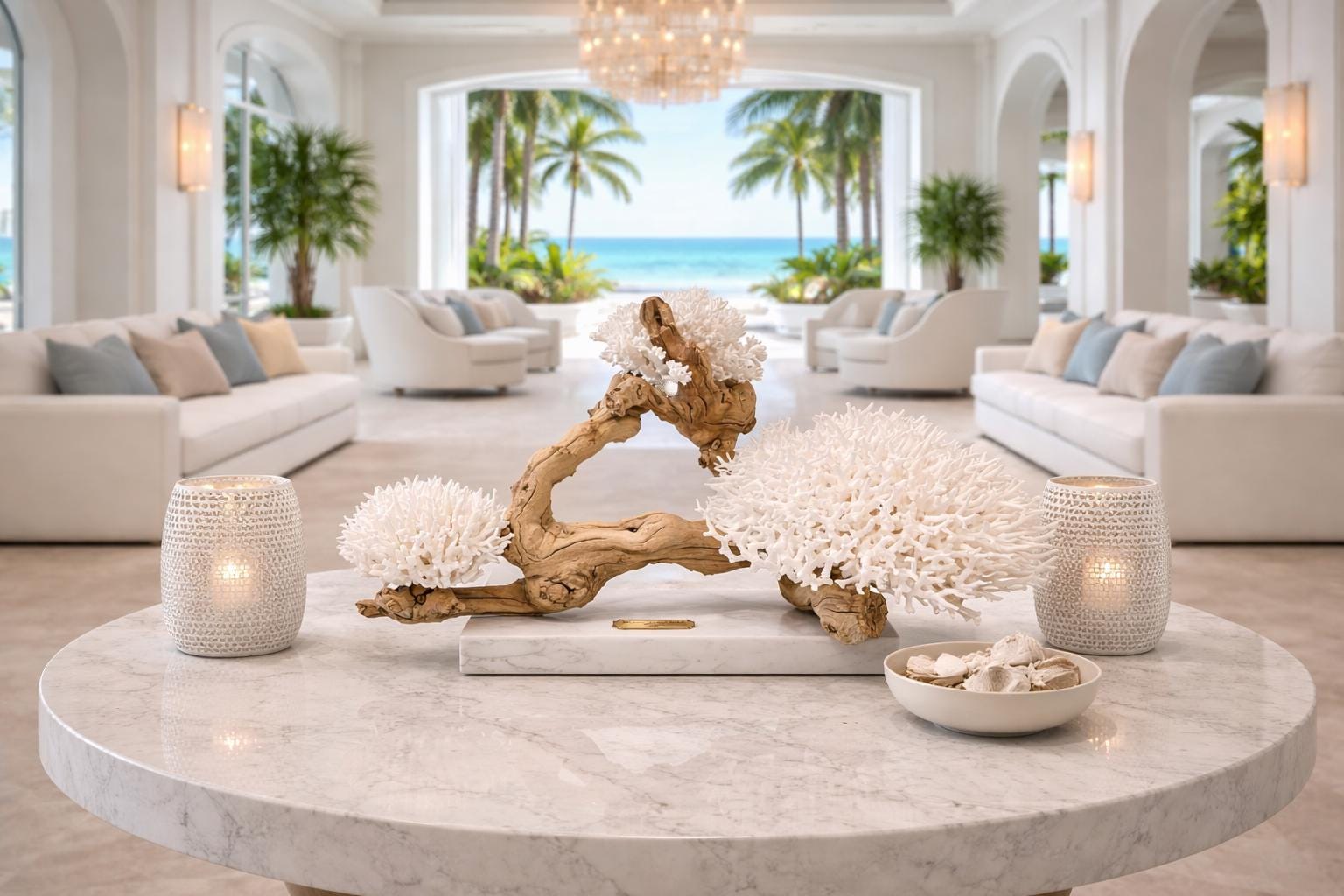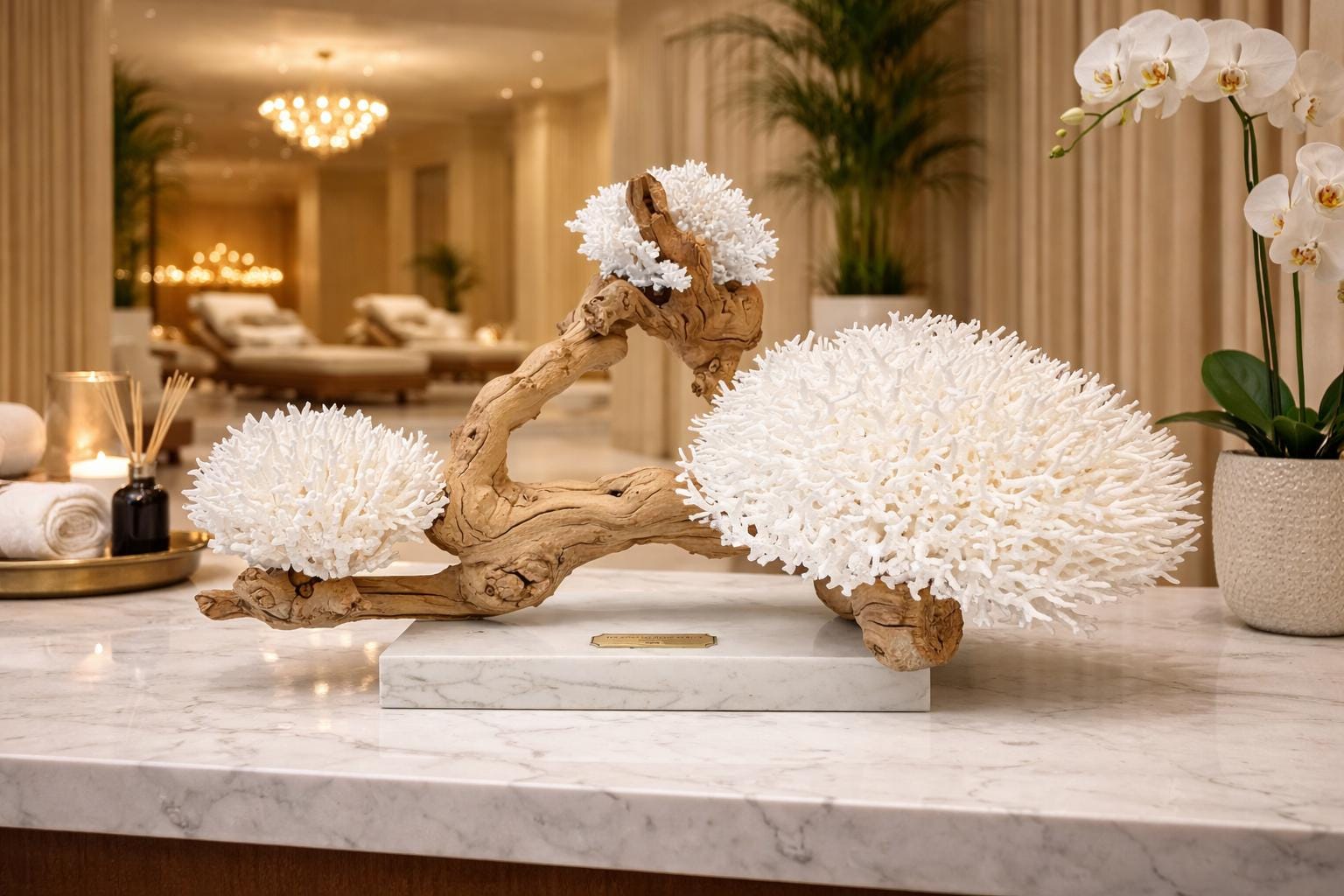 A one-of-a-kind coastal sculpture crafted from natural driftwood and pristine white coral, mounted on a solid marble base. This museum-quality statement piece brings the organic beauty of the ocean into refined interiors and is designed to serve as a striking centerpiece in luxury coastal homes.