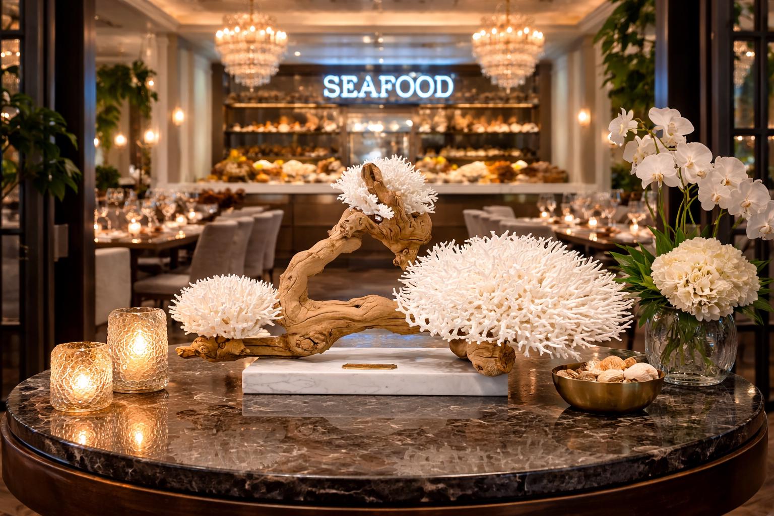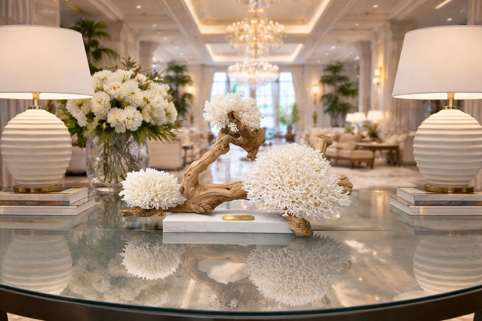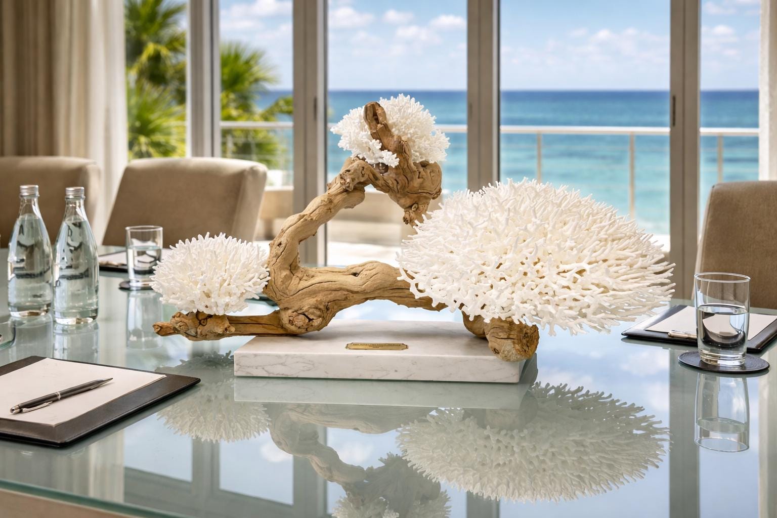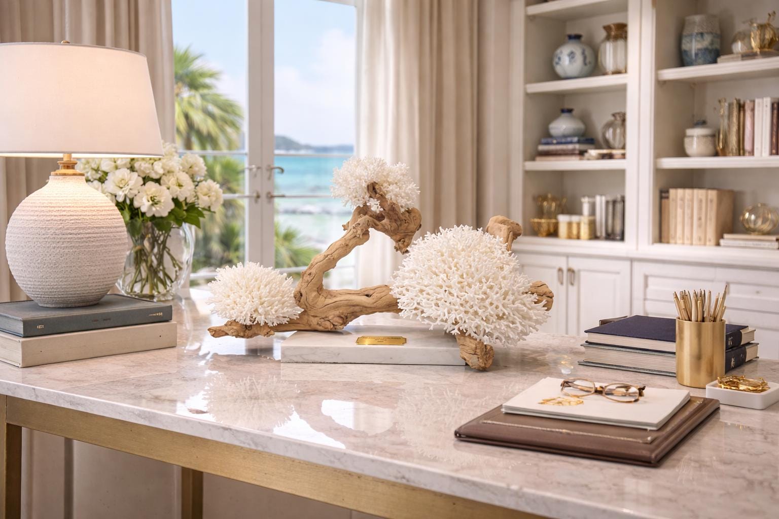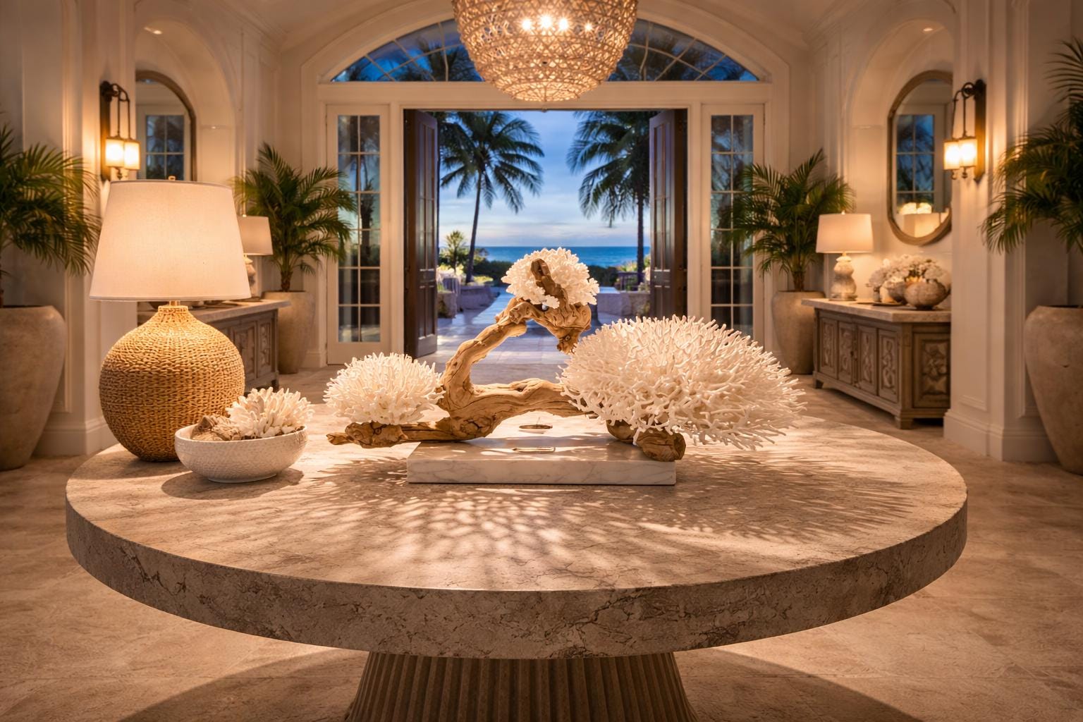 A one-of-a-kind coastal sculpture crafted from natural driftwood and pristine white coral, mounted on a solid marble base. This museum-quality statement piece brings the organic beauty of the ocean into refined interiors and is designed to serve as a striking centerpiece in luxury coastal homes.