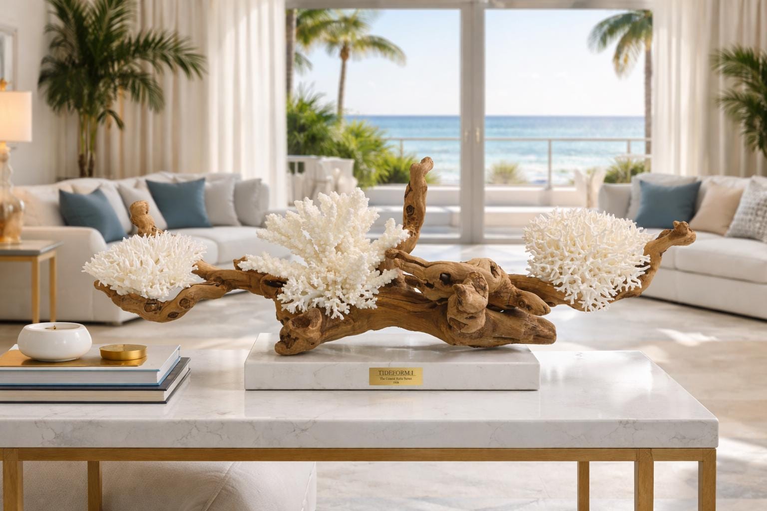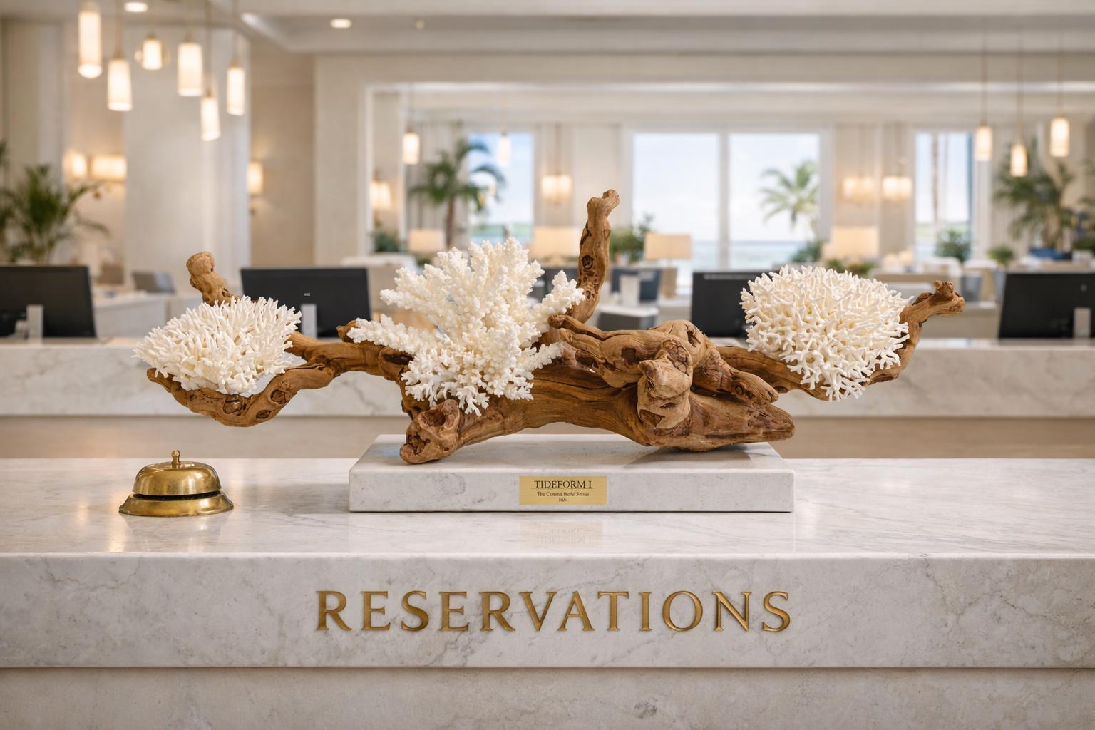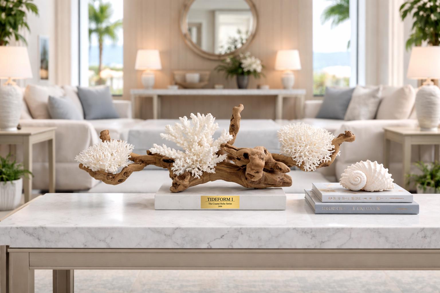 Each sculpture begins with carefully sourced natural elements — weathered driftwood, sculptural coral, and organic coastal materials — selected for their unique form, texture, and presence. These elements are then composed into balanced, architectural arrangements that elevate them from found objects into collectible works of art.