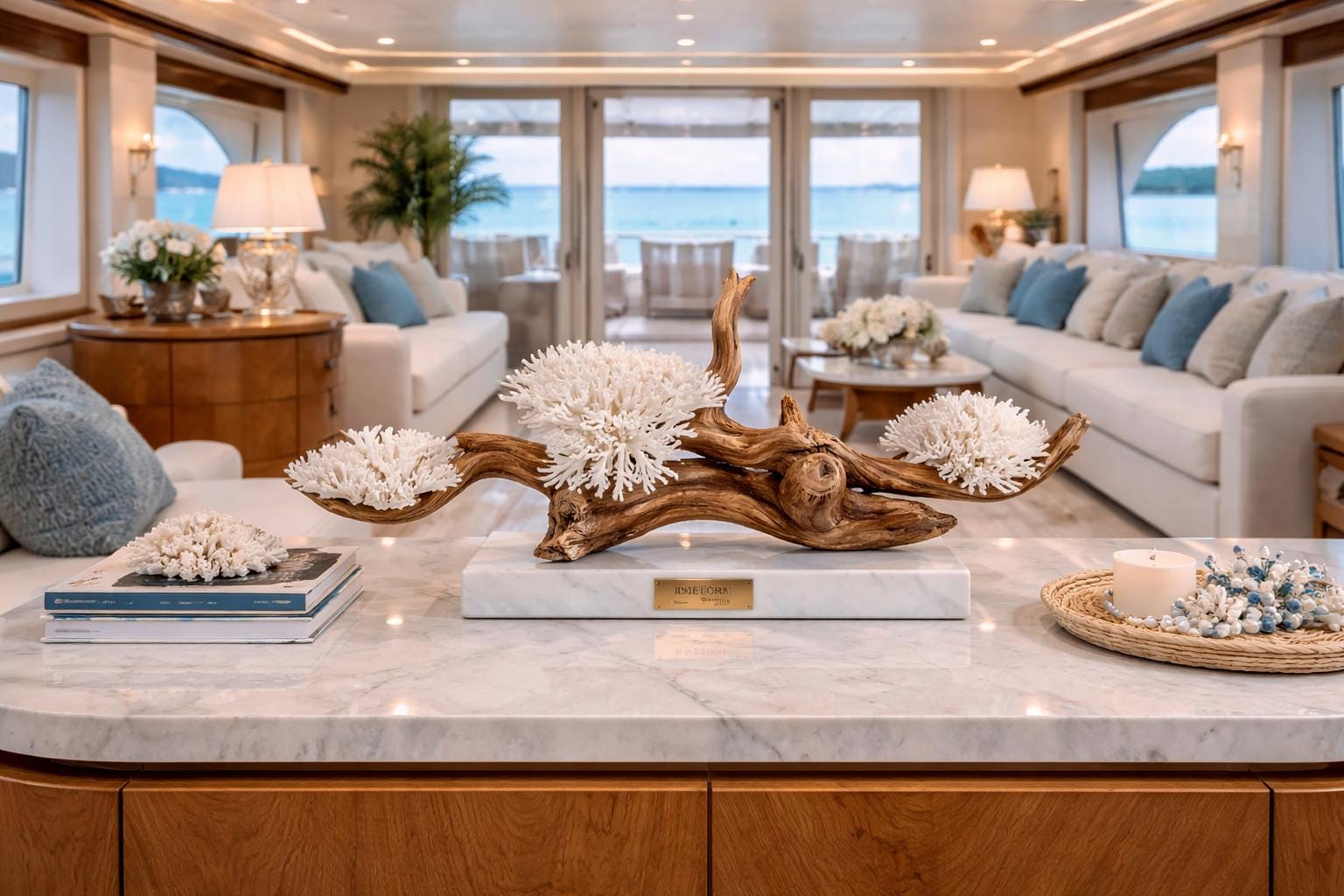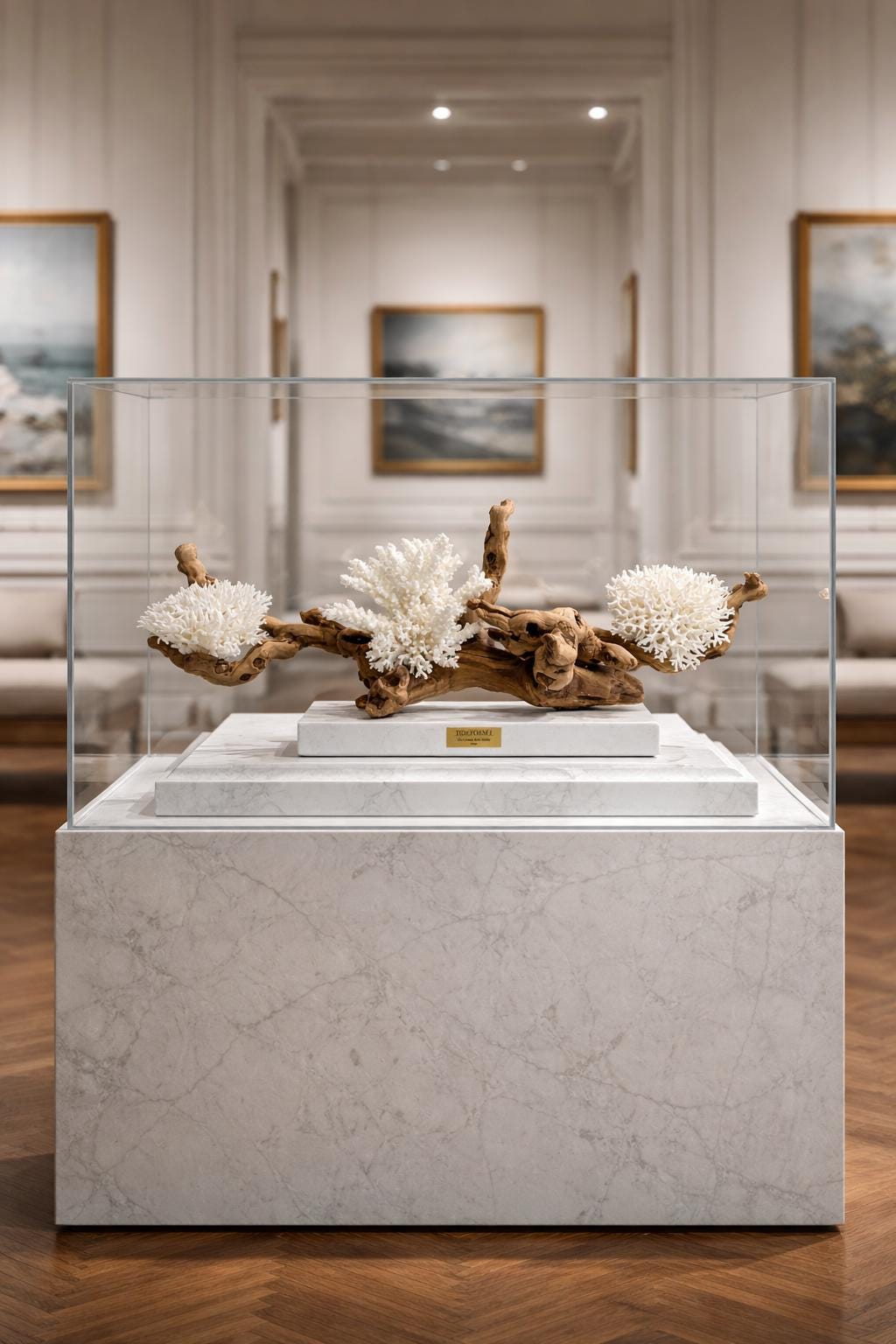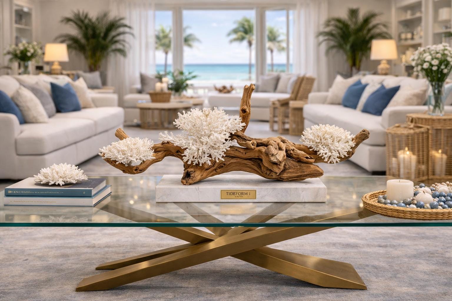 Each sculpture begins with carefully sourced natural elements — weathered driftwood, sculptural coral, and organic coastal materials — selected for their unique form, texture, and presence. These elements are then composed into balanced, architectural arrangements that elevate them from found objects into collectible works of art.