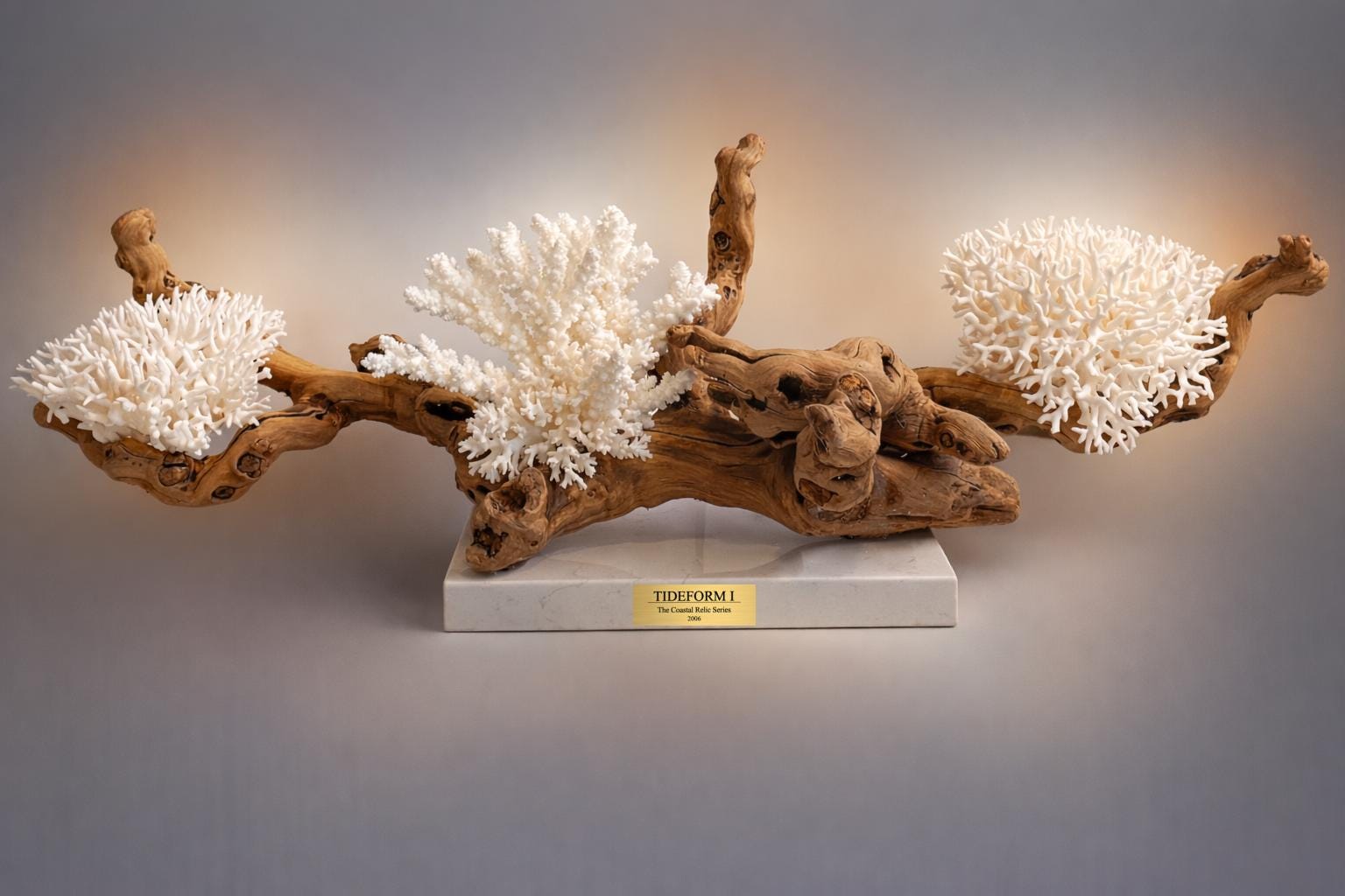 A one-of-a-kind coastal sculpture crafted from natural driftwood and pristine white coral, mounted on a solid marble base. Tideform 1 is one of five original sculptures from The Coastal Relic Series 1 - Collection 1. **Coastal Abode Atelier — Coastal Relic Collection**